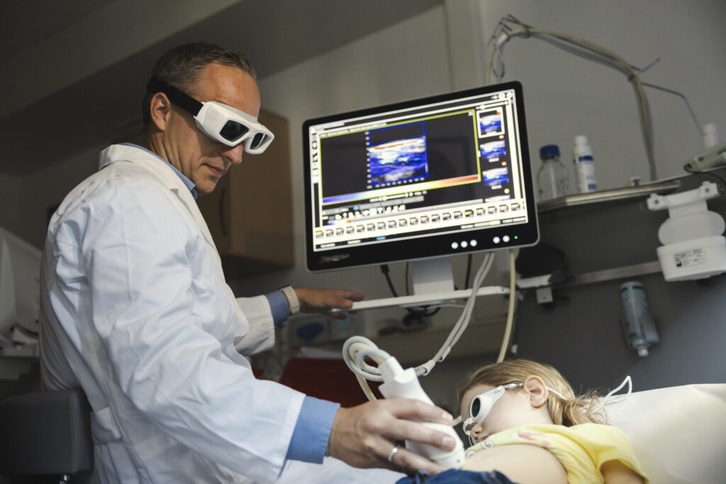 Ferdinand Knieling enters a room where the lights are dimmed and several ultrasound machines are located. The doctor points to a futuristic looking machine used for the procedure known as multi-spectral optoacoustic tomography (MSOT). MSOT is an innovative method that uses short-wave laser light to generate vibrations in the body. Highly sensitive detectors detect these vibrations and use them to create an image, similarly to standard ultrasound. “Light in, sound out: The different substances in the body such as lipids, hemoglobin or connective tissue absorb the light in different ways and become visible. The intestines become even more visible if the patient is given a harmless contrast dye that doesn’t need to be injected and can be swallowed instead,” he explains. “Using improved and more specific dyes in future may allow inflammation in the gut to be pinpointed even more accurately. This method would be particularly well suited to children, as the organs are located only a few centimeters below the surface of the skin and any alterations can be spotted well using the laser method.”
