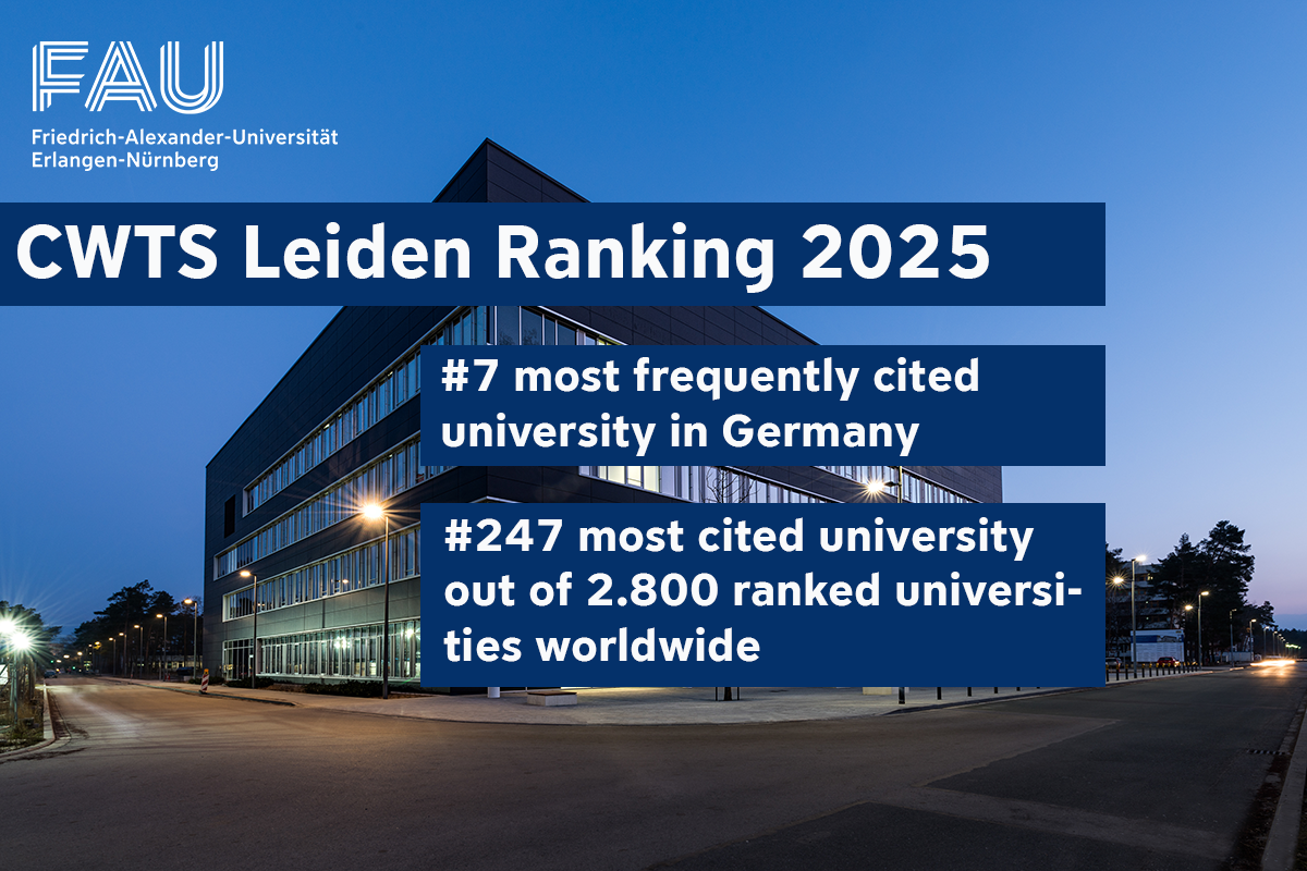 Taken on the basis of the most-cited publications, FAU is ranked number 7 in Germany, and has therefore remained in the top ten every year since the Leiden Ranking was published for the first time in 2007. Internationally, FAU is on place 247, remaining like last year among the top 250 best universities in the world.