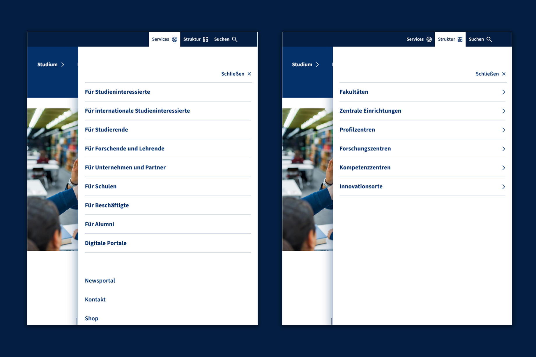 The new structure is deliberately orientated towards the needs of the various target groups: the focus is on studying, research and the University. Prospective students, students and researchers can all find the information relevant to them quickly. Entry points specifically tailored to each of the target groups make it easier for them to find exactly what they are looking for. Innovation has deliberately been given a prominent place, expressing our position as the most innovative university in Germany.