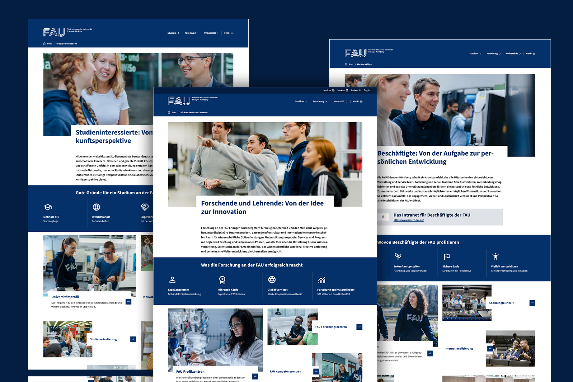The new design theme “FAU Elemental” makes our mission “Moving knowledge” visible: Lines and shapes, inspired by our vivid FAU logo, give insights and open perspectives. Nearly all the images show real people at our University: students, researchers, employees. This makes the website authentic and approachable. Our brand values of innovation, diversity and passion are reflected in every aspect of the website. “Every decision in this project was guided by making FAU as a whole visible and making its identity come alive in every detail”, explains Silke Sauer, Chief Brand Officer at FAU and responsible for the relaunch.