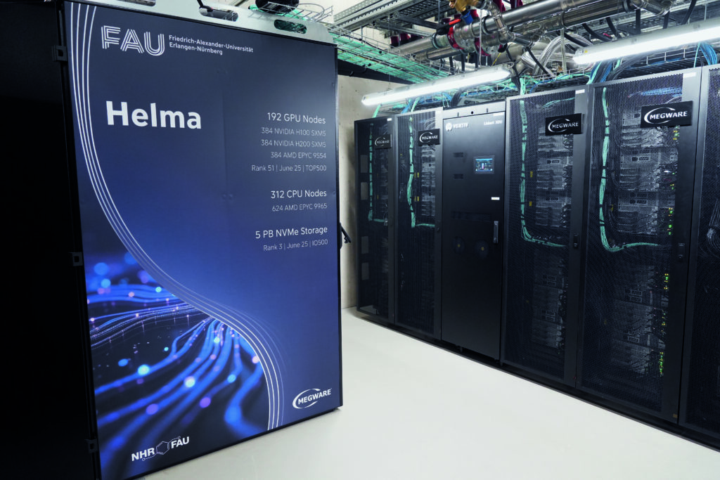 The room is bathed in pale neon light, and a loud humming makes conversation almost impossible. The interior is not very inviting either: walls of bare concrete, a tangle of water pipes on the ceiling leading to a few dark gray cabinets. Behind their perforated fronts, green and yellow LEDs are blinking, providing a few sparse splashes of color. The cabinets house a computer that FAU is quite proud of. It consists of 192 connected compute nodes, each of which is powered by four high-end Nvidia GPUs. The cluster goes by the charming name of “Helma” – after Wilhelmine, Margravine of Brandenburg-Bayreuth, whose husband Friedrich founded the University of Erlangen in 1743 and who later bequeathed her private library to the university.