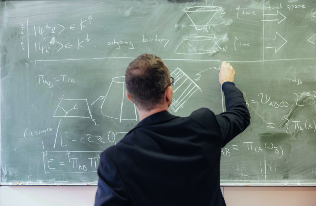 Wolfgang Wieland sits in his office on Erlangen’s Staudtstraße, a coffee cup beside him, a white wall behind him. He does have a computer, but he prefers to work with pencil and paper. With these, he sketches ideas and calculations that could revolutionize our understanding of the universe. “The problem with physics,” he says matter-of-factly, “is that its two central models, quantum mechanics and relativity, still do not fit together.” Wieland is working with leading researchers at the Chair of Theoretical Physics III on a theory of quantum gravity with which they hope to resolve this contradiction. If they succeed, they will have cracked the toughest nut of modern physics. In his general theory of relativity, Albert Einstein defined gravitation – that is, gravity – as the curvature of spacetime. It determines the distribution of galaxies in the universe and keeps planets in their orbits. The best way to describe spacetime is as an invisible, elastic net that is deformed by masses and forces light rays to follow the resulting curvature.