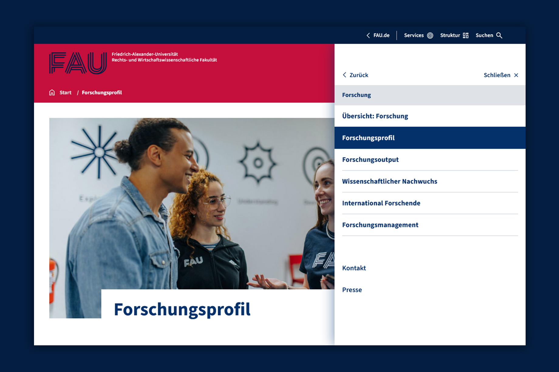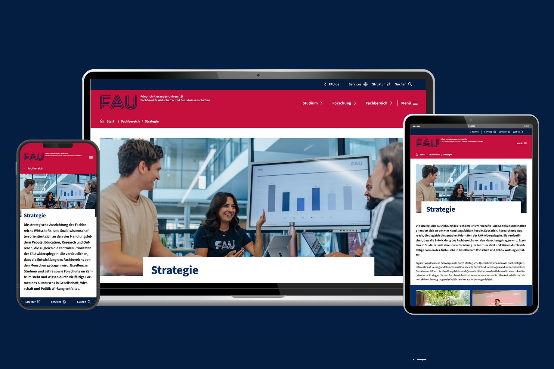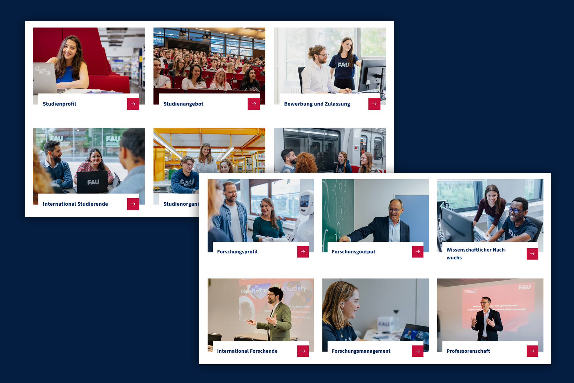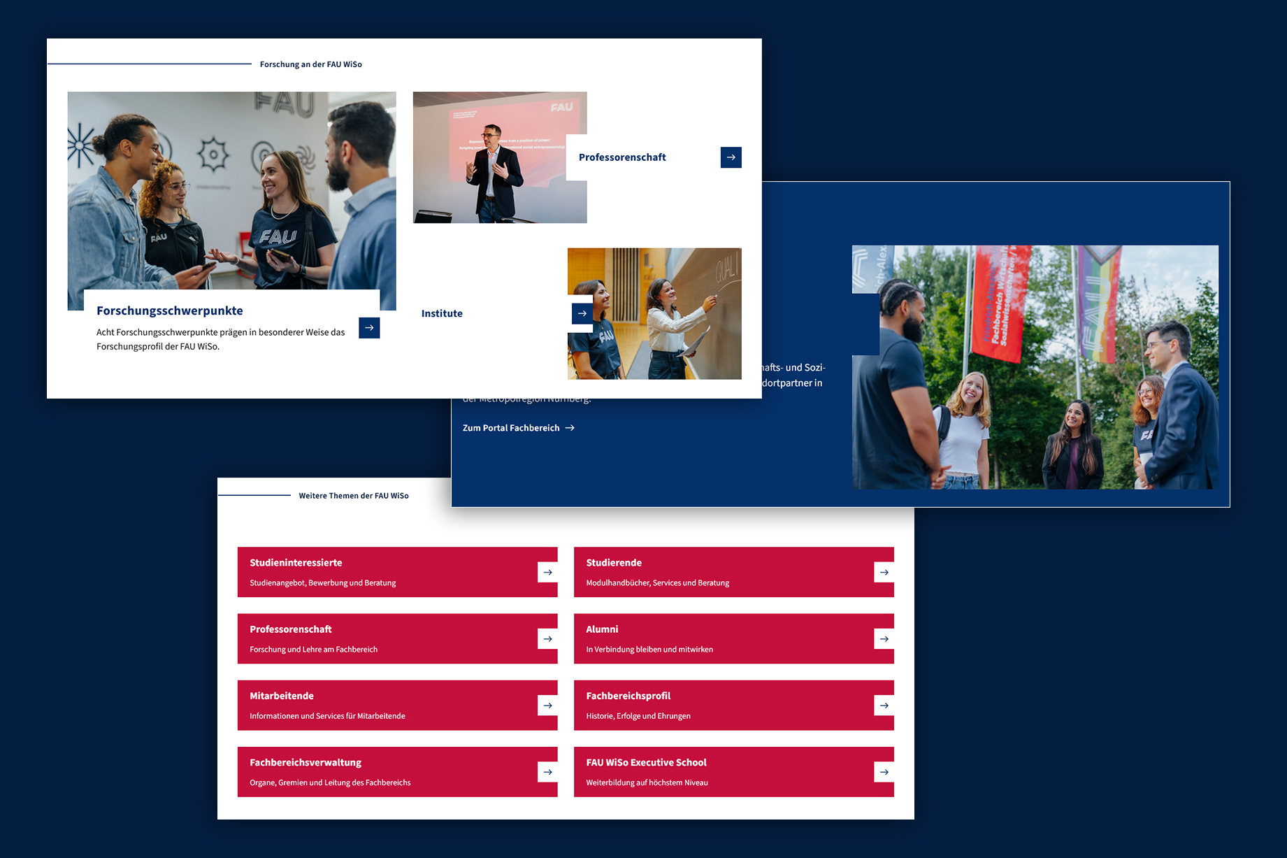The new pages combine clear structures, intuitive navigation, and a visual concept that communicates FAU’s identity. Authentic images of students, researchers, and staff from everyday campus life bring the faculty to life and foster closeness and transparency. At the same time, the new design makes the guiding principle “Moving Knowledge” visible. Technically, the site is built to remain future-proof: it is accessible, mobile-optimized, features an improved search, and is based on WordPress as a flexible, scalable system. The relaunch was realized in collaboration with the Hamburg-based agency Mondula (technical) and Berlin-based Studio Good (design).