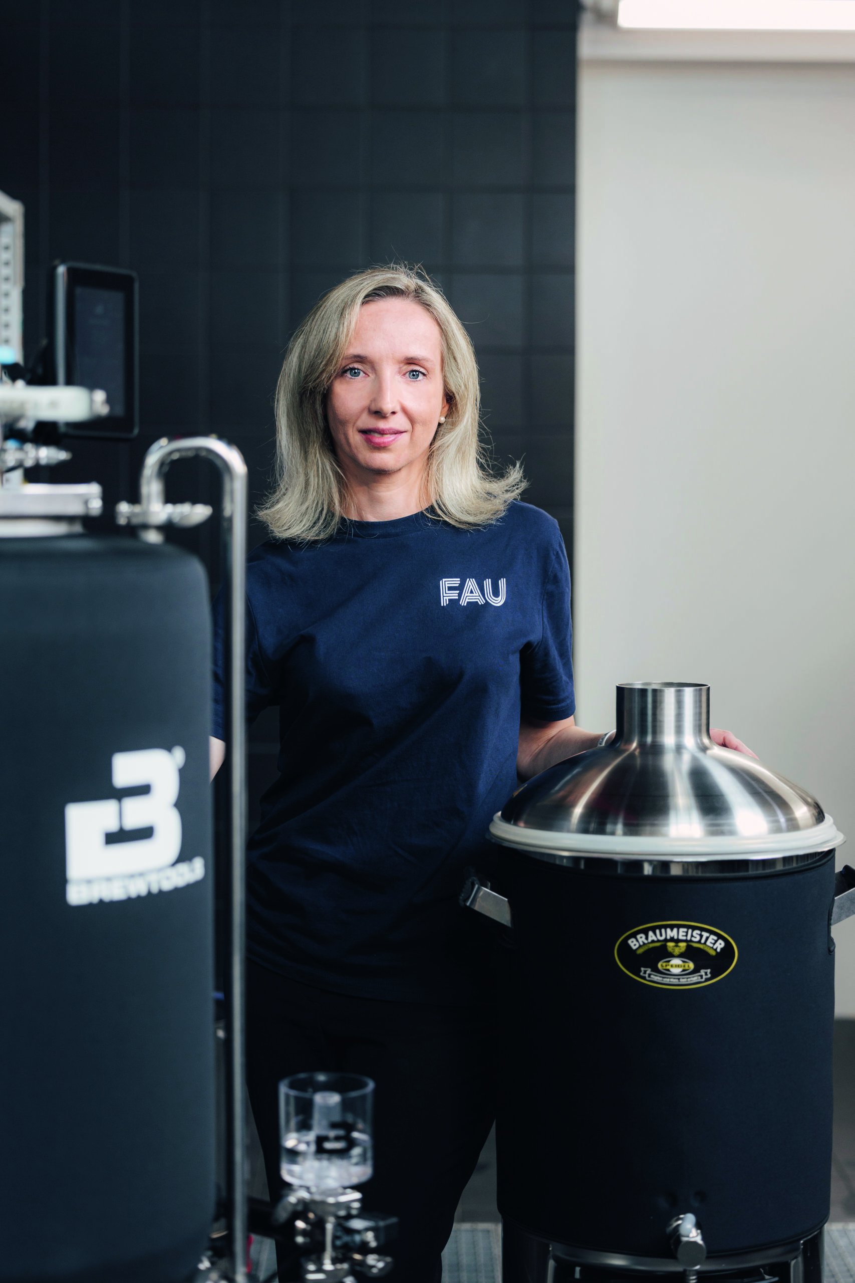 Castiglione holds the Chair of Bioprocess Engineering and offers one of the most sought-after practical courses at FAU: Each semester, 30 to 40 students have the opportunity to brew beer: Helles, Weizen, Bock, Porter, various ales. The handmade specialties, called craft beers, are labeled with the “Röthelheimbräu” brand. In the former riding hall at the brewery location in Erlangen’s Rötelheim, everything needed for brewing beer can be found: Grain mill, hop scale, and the Braumeister brewing units, in which the entire fermentation process takes place and can be monitored on a digital display. Five of these stainless steel containers, each holding 50 liters, allow five different types of beer to be brewed at the same time. The Röthelheim Brewery has existed since 2009, founded by Castiglione’s predecessor Professor Rainer Buchholz. In 2018, Kathrin Castiglione took over the project. “Right at my interview, students asked me if I would continue running the brewery,” she says. “I didn’t have to think long, because brewing beer offers the ideal opportunity to understand bioprocess engineering and put it into practice. And what could be better than not only documenting the result, but also tasting it?”