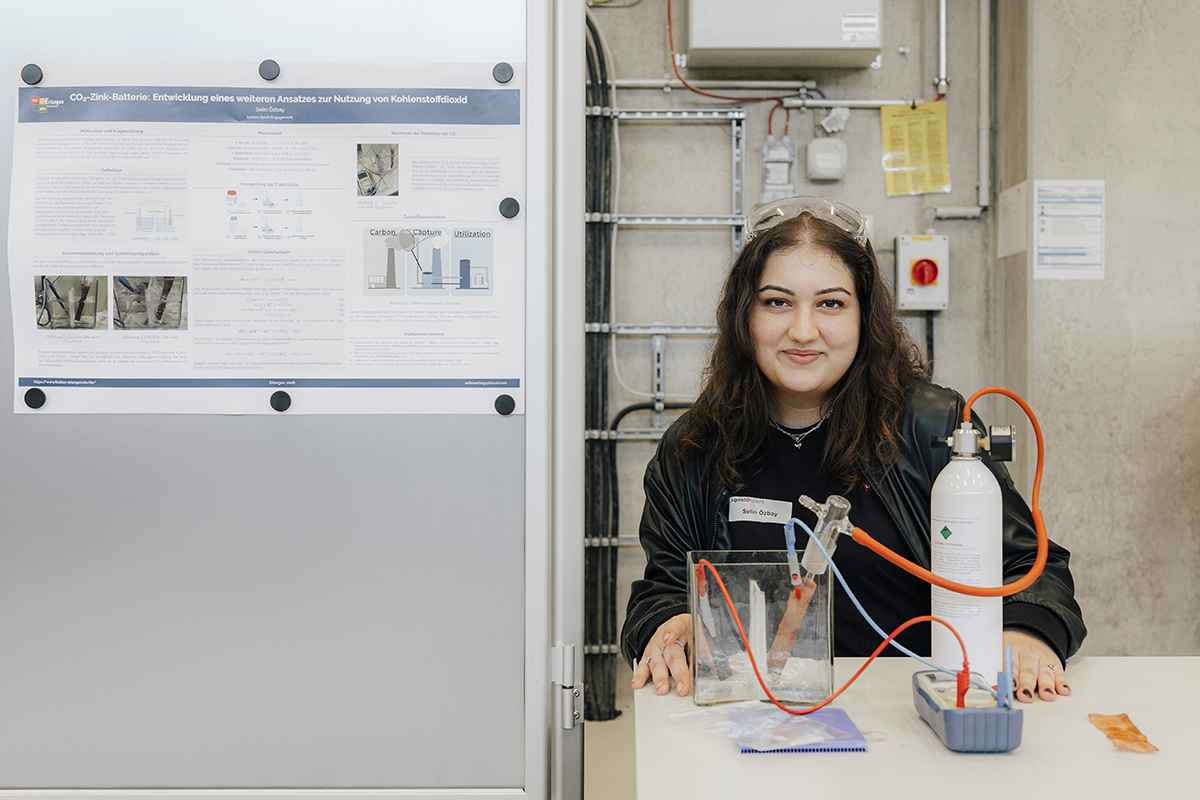 Selin Özbay’s topic is sustainable energy use. A CO2-zinc battery she developed is designed to utilize CO2. The regional competition is not her first time at FAU: The student from the Fachoberschule Erlangen spent a two-week internship at the Department of Physics. “This has made me realize that studying physics is the right choice for me.”