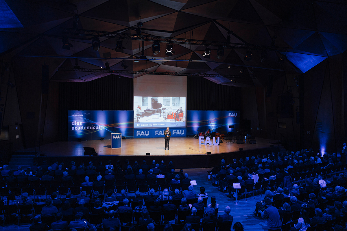 The Dies academicus at FAU is attended by members, friends and supporters of the University as well as important public figures and gives the President the opportunity to look back over the most important events and developments of the past year and set out the University’s plans for the coming year in the “President’s report”. During the ceremony, various honors and prestigious awards of outstanding importance for the University are presented, for example the title of Honorary Senator, FAU Ambassador or the prize for the promotion of equal opportunities and diversity.